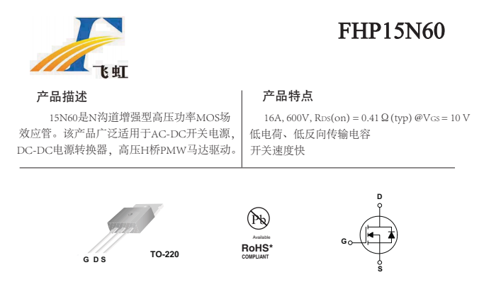 FHP15N60的主要封裝形式是TO-220、TO-220F、TO-3PN,腳位排列位GDS。這款15N60場效應管產品具體參數:Vgs(±V):30;VTH(V):3-5;ID(A):16;BVdss(V):600。RDS (on) = 0.41mΩ(typ)@V GS =10V,低電荷、低反向傳輸電容開關速度快的特點。