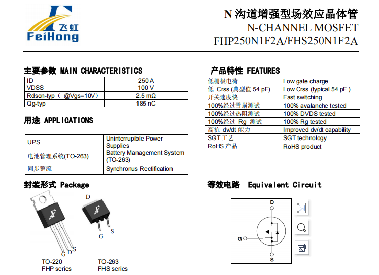 FHP250N1F2A的封裝形式是TO-220、TO-263。這款產(chǎn)品參數(shù):VTH(V):2-4;ID(A):250;BVdss(V):100、Vgs(±V):20;。